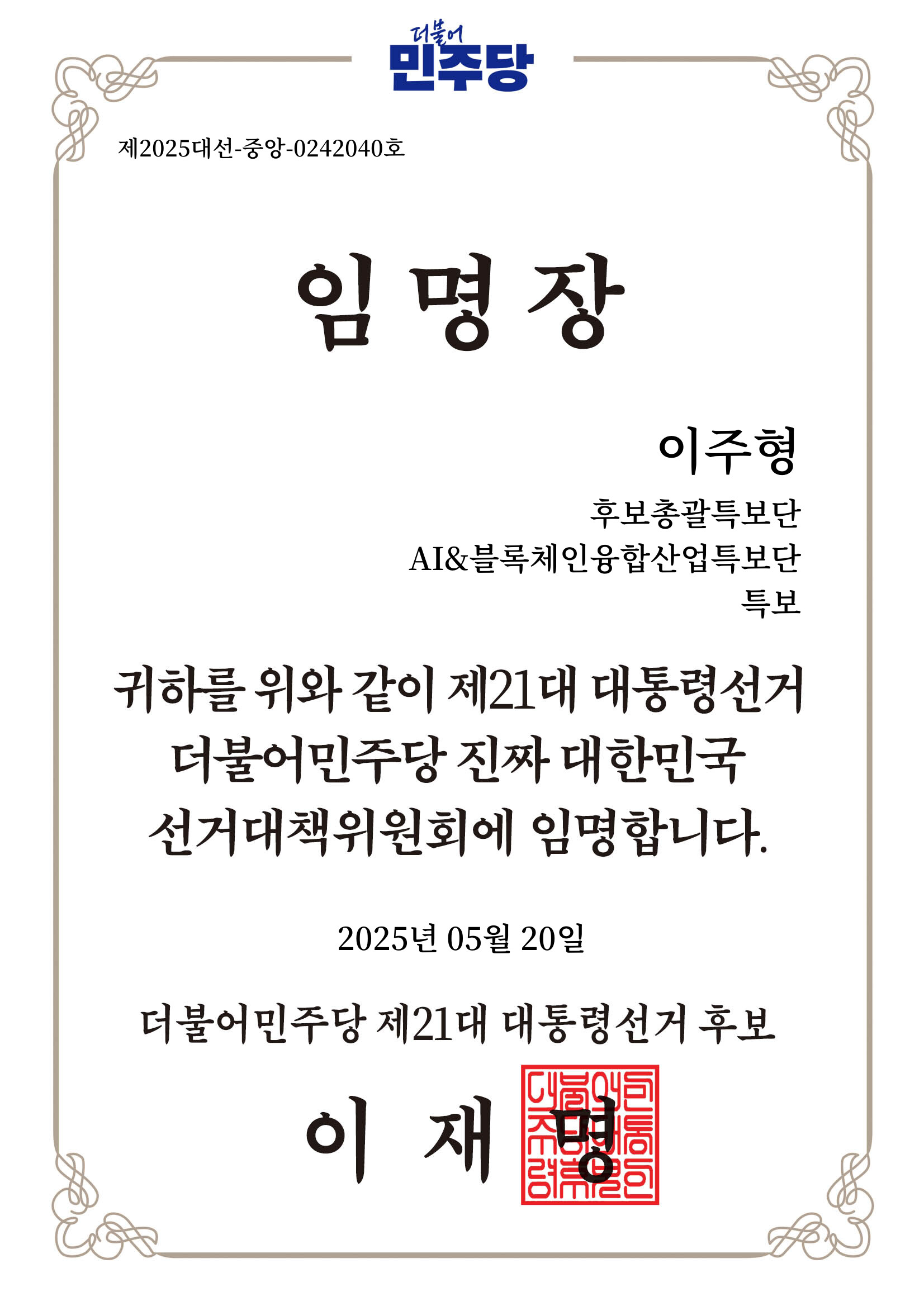 - 전 민주당 대선캠프 AI&블록체인융합산업 특보